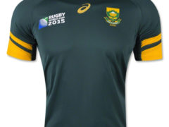 南非国家队参加 2015 年橄榄球世界杯的主客场球衣,球衣赞助商为 ASICS。 主场球衣: 客场球衣: