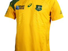 澳大利亚国家队参加 2015 年橄榄球世界杯的主客场球衣,球衣赞助商为 ASICS。 主场球衣: 客场球衣: