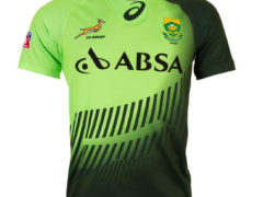 南非七人制橄榄球国家队 2014-15 赛季主客场球衣,球衣赞助商为 ASICS。 主场球衣: 客场球衣: