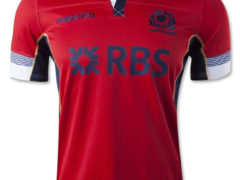 苏格兰橄榄球代表队 2014-15 赛季客场球衣,球衣赞助商为 Macron。