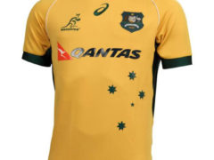 澳大利亚橄榄球国家队 2014 赛季主场球衣,球衣赞助商为 ASICS。