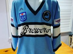 克罗纳拉-萨瑟兰鲨鱼联盟式橄榄球队发布 1990 赛季主场球衣。 主场球衣: